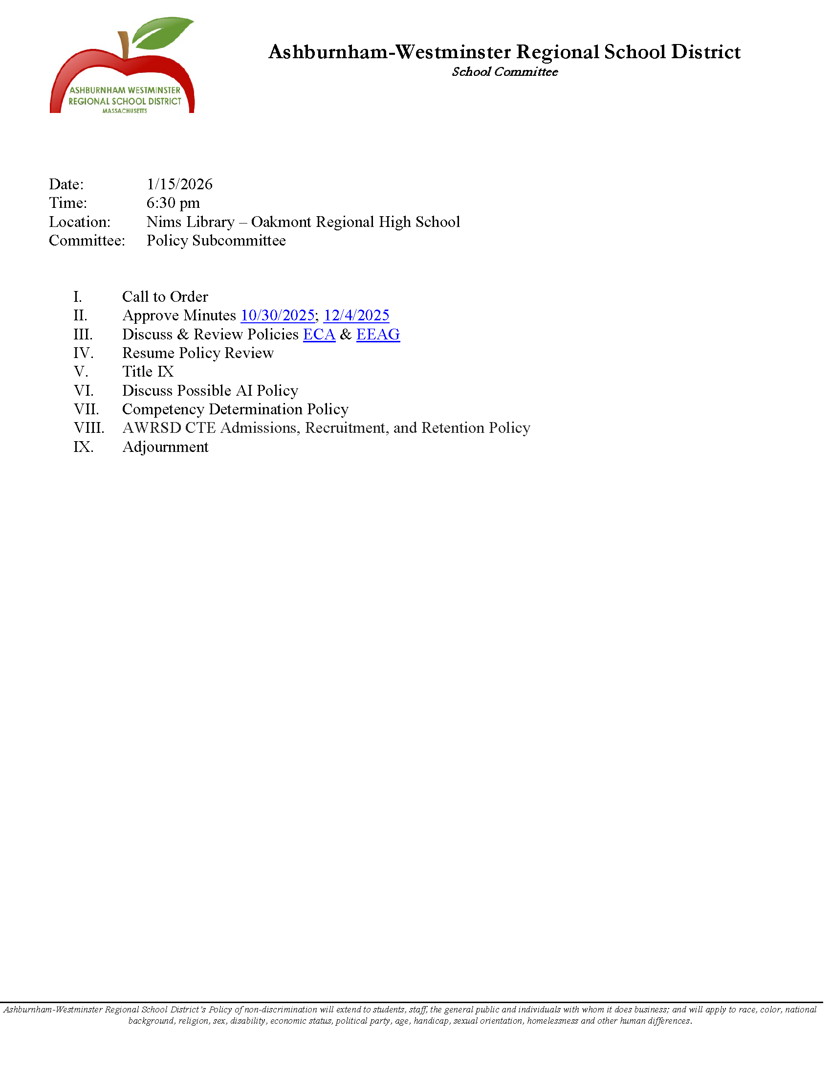 The Policy Subcommittee of the AWRSD School Committee will meet 1/15/2026 at 6:30pm in Nims Library in Oakmont Regional High School.